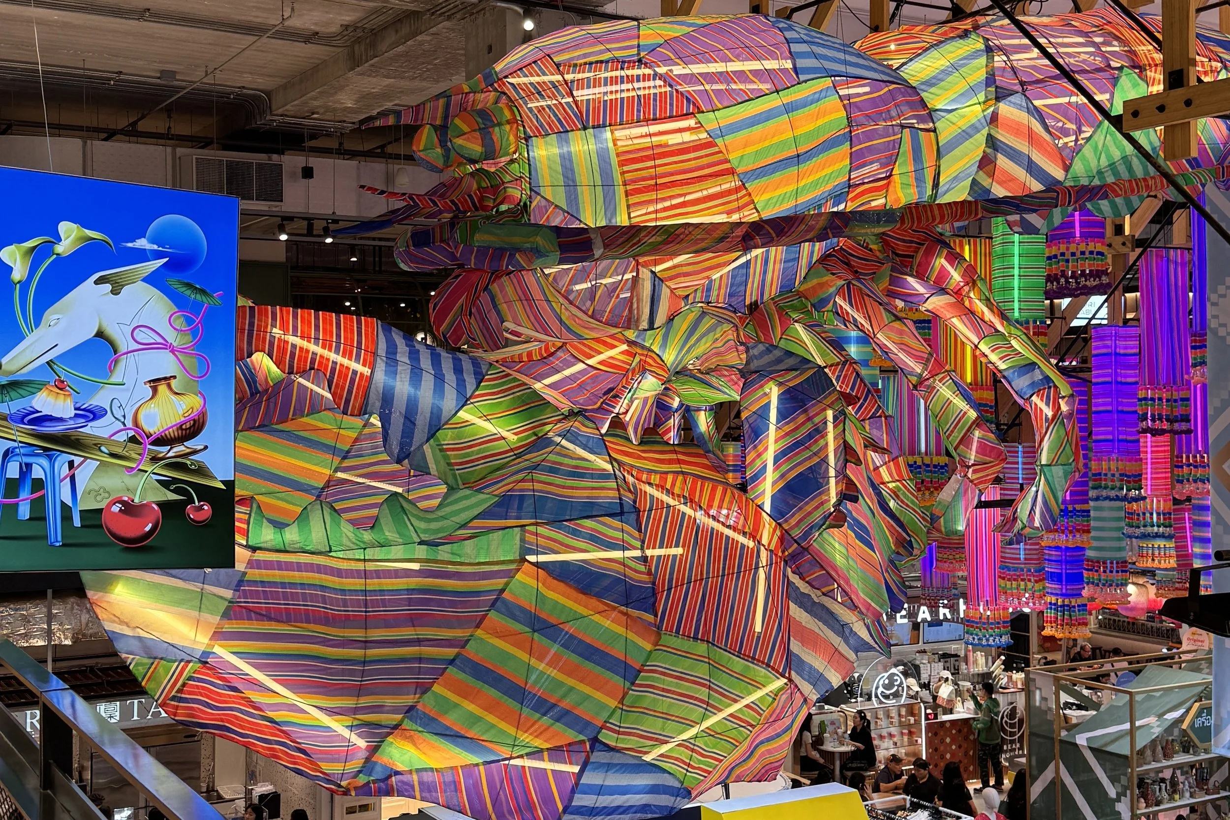 A giant lobster made from Thung Rung bags — Thailand's iconic striped plastic bags. Emsphere Mall, Bangkok.